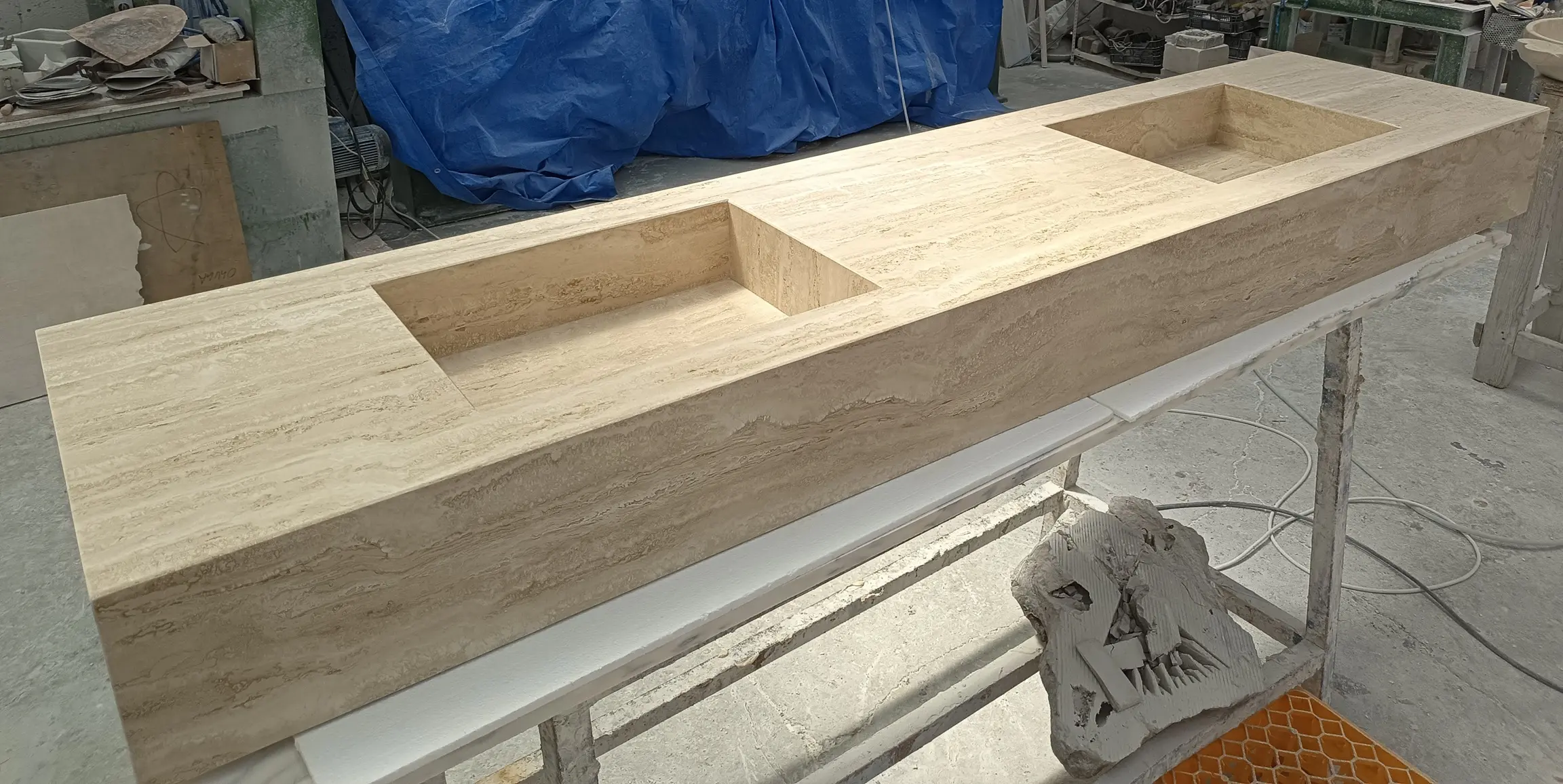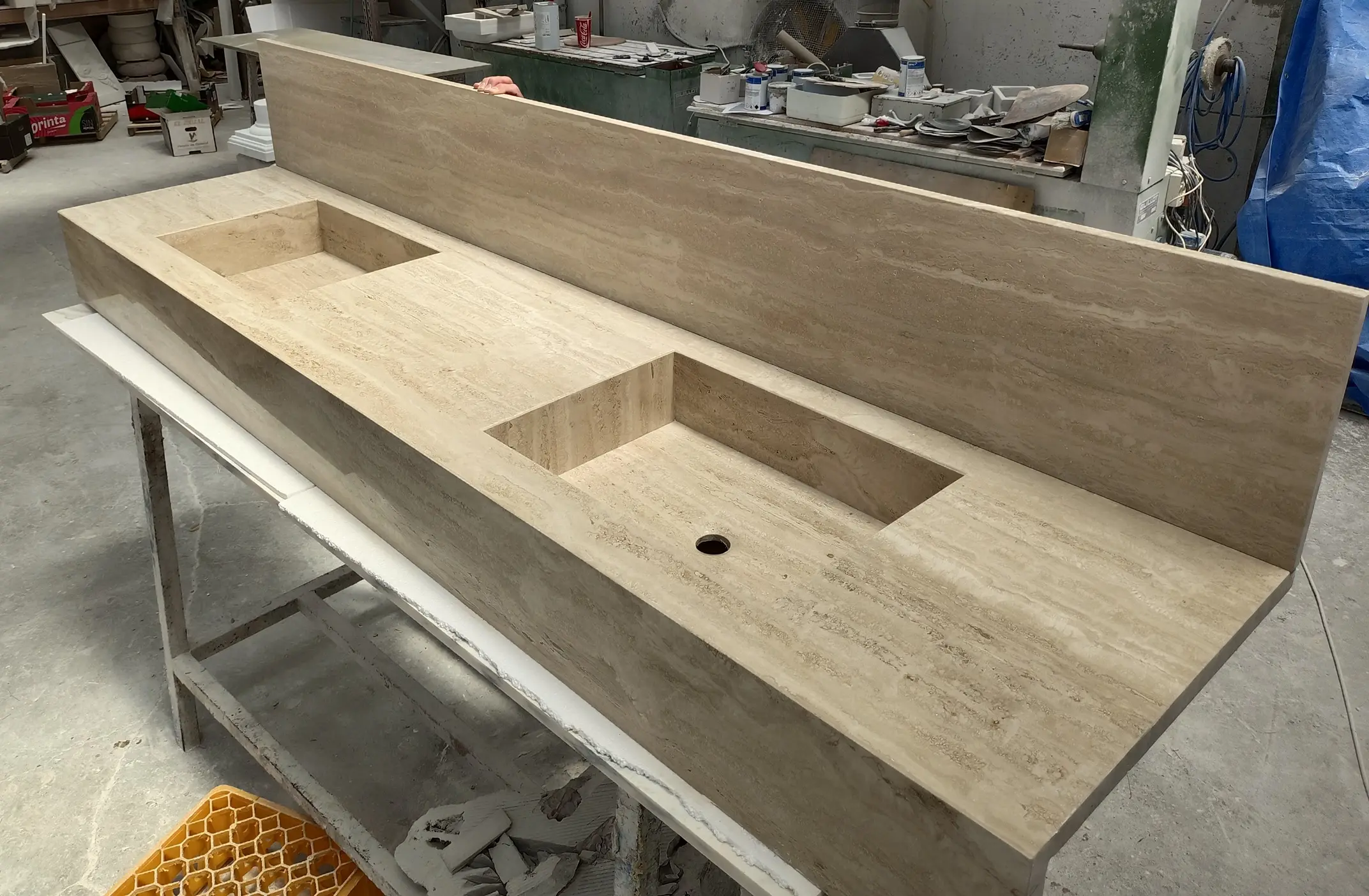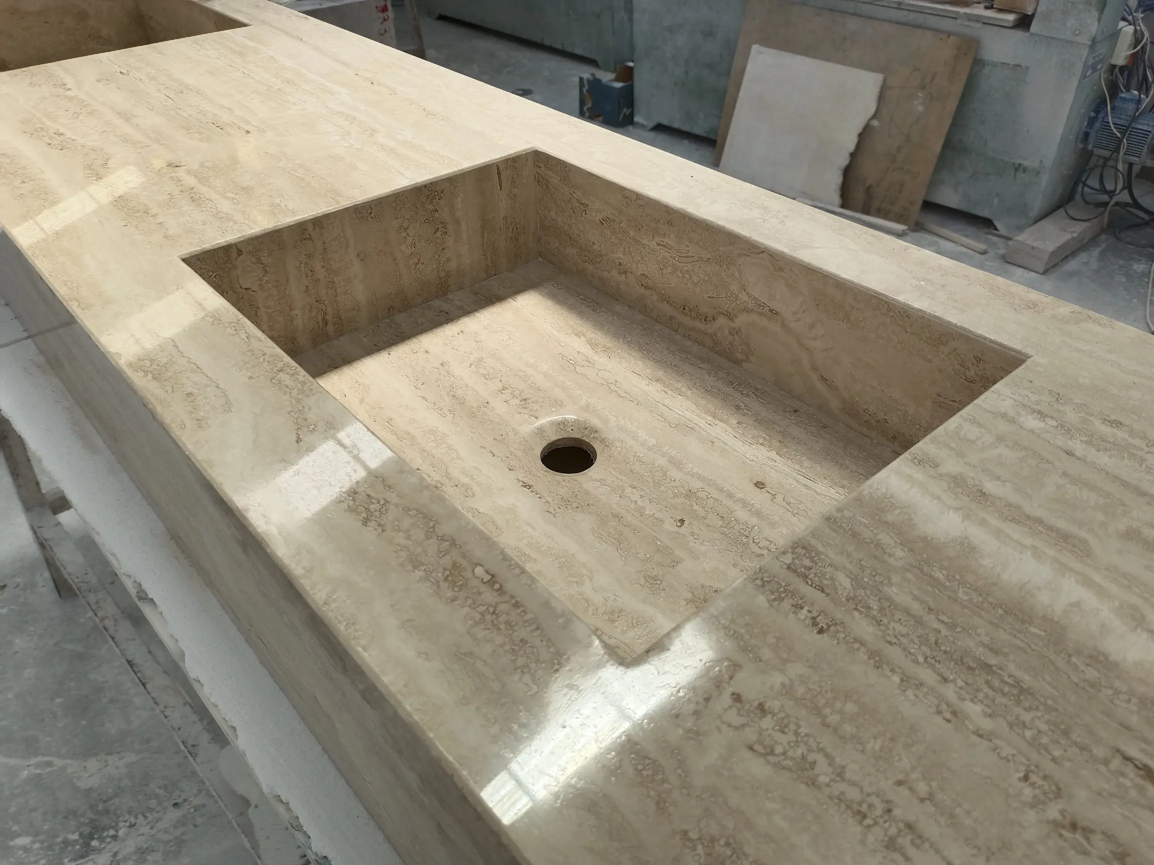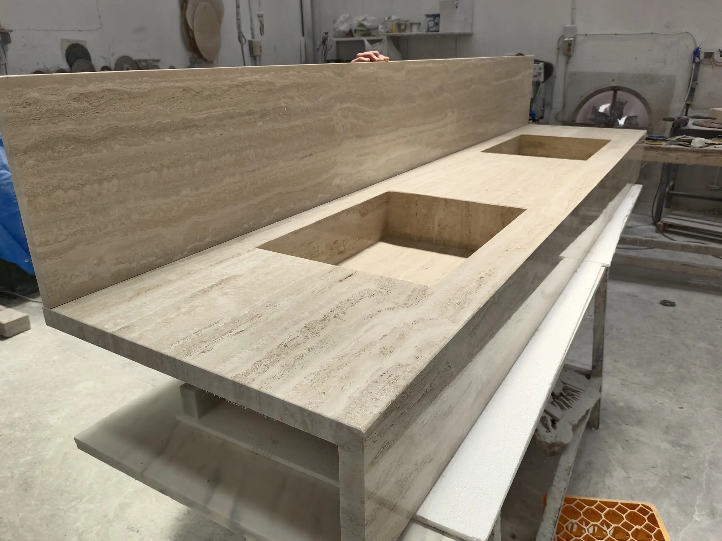 ENCIMERA ESPECIAL A MEDIDA, TRAVERTINO REALIZADO EN TABLA A INGLETE.